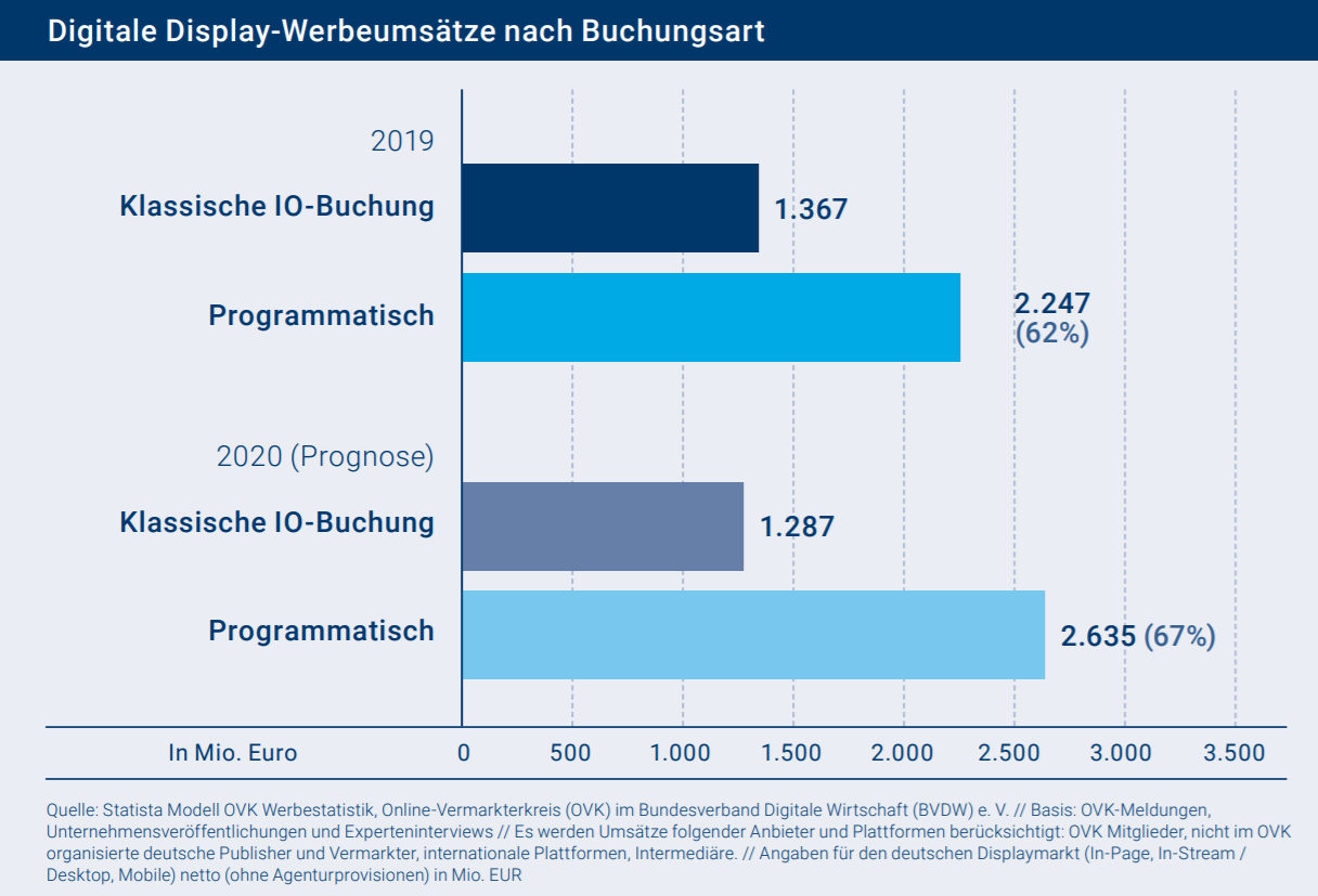 Jahr 2020 erwartet. Davon werden laut Prognose des BVDW mehr als zwei Drittel (67 Prozent) der Umsätze 2020 programmatisch generiert. Wurden 2019 insgesamt 2,25 Mrd. Euro über programmatische Systeme umgesetzt, was einem Anteil von 62 Prozent der gesamten Display-Umsätze entspricht, werden für 2020 2,63 Mrd. Euro Programmatic-Umsätze erwartet. Das ist eine Erhöhung um 5 Prozent. „Die Werbungtreibenden shiften ihre Budgets signifikant in die digitalen Kanäle. Sicherlich auch, weil die Coronapandemie die Verbreitung und die Nutzung digitaler Medien nochmals verstärkt hat“, ergänzt Rasmus Giese, Vorsitzender des OVK.